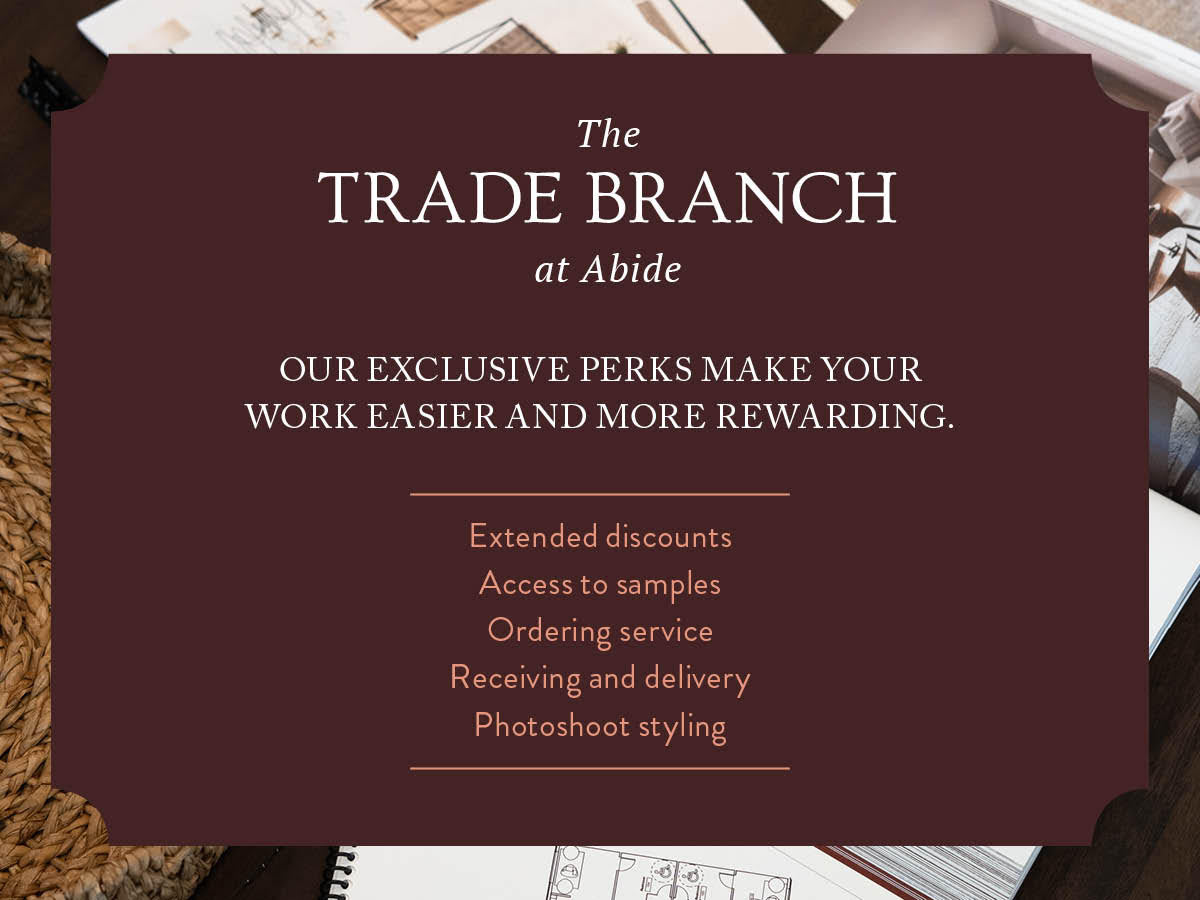 At Abide, we love supporting Interior Design Professional. Our exclusive perks make your work easier and more rewarding. Enjoy extended discounts on all retail, access to a curated selection of samples, and a seamless ordering process.