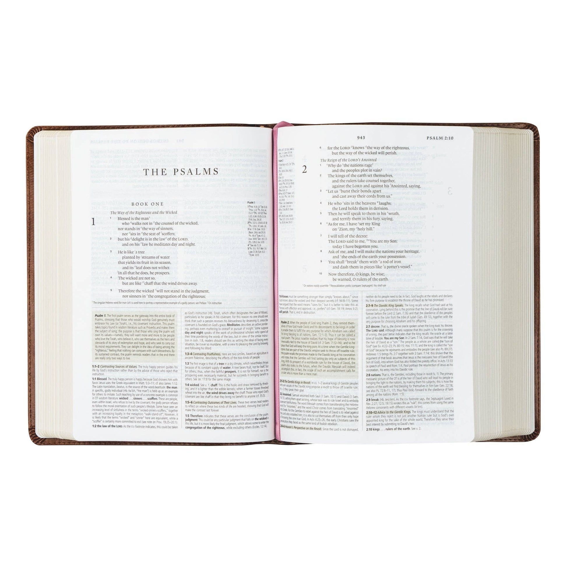 The inspiration for this beautiful leather-like Bible comes from the beautiful city of Aurora, Colorado, nicknamed “The Gateway to the Rockies.” Aurora is surrounded by large meadows filled with gorgeous flowers with the Rocky Mountains looming large in the background. The front cover of our very first leather-like ESV Study Bible features pressed floral artwork, and the back cover displays Joshua 1:8, which says, “This book of the law shall not depart from your mouth, but you shall meditate on it day and night.” For many years, the ESV Study Bible has been a priceless resource for people all over the world.