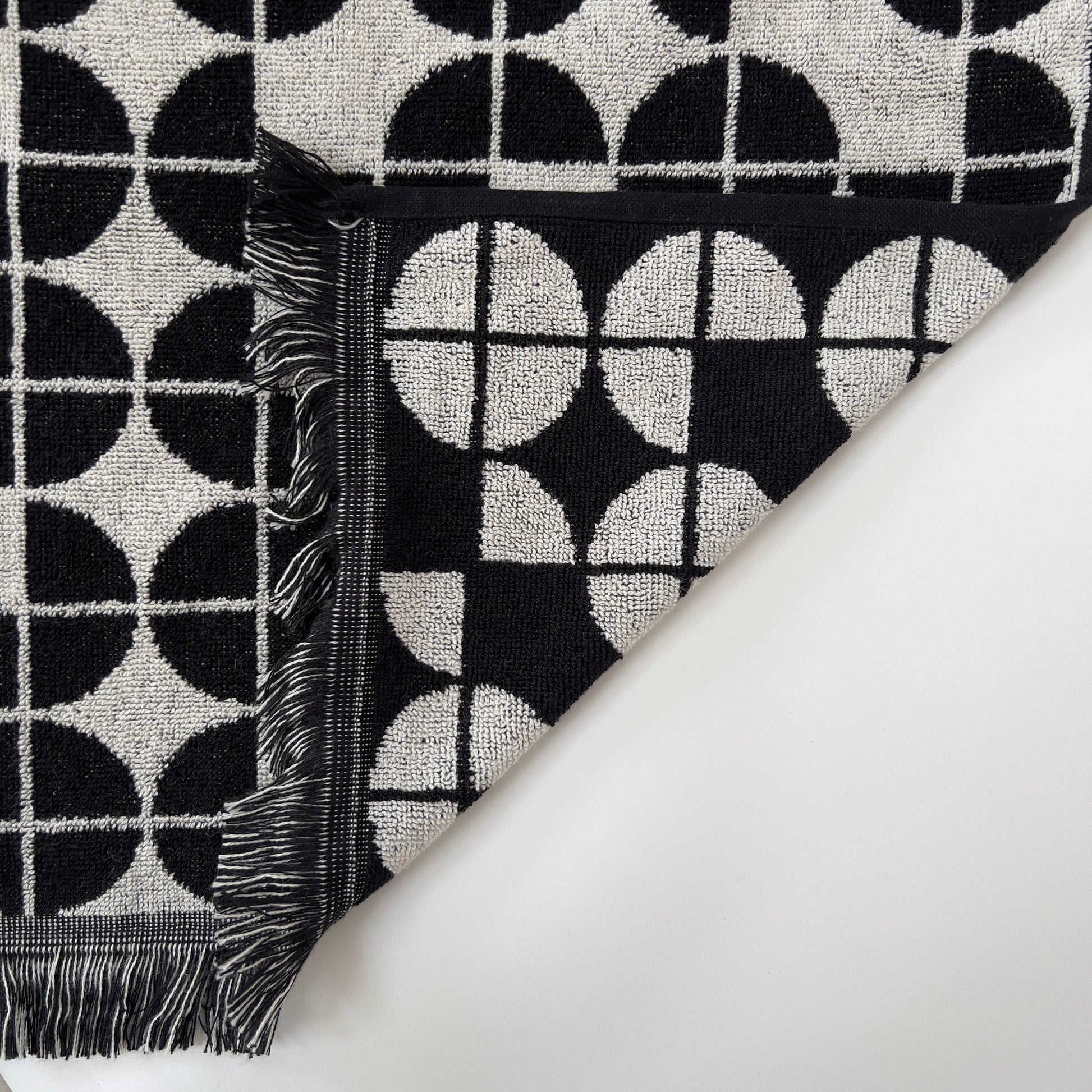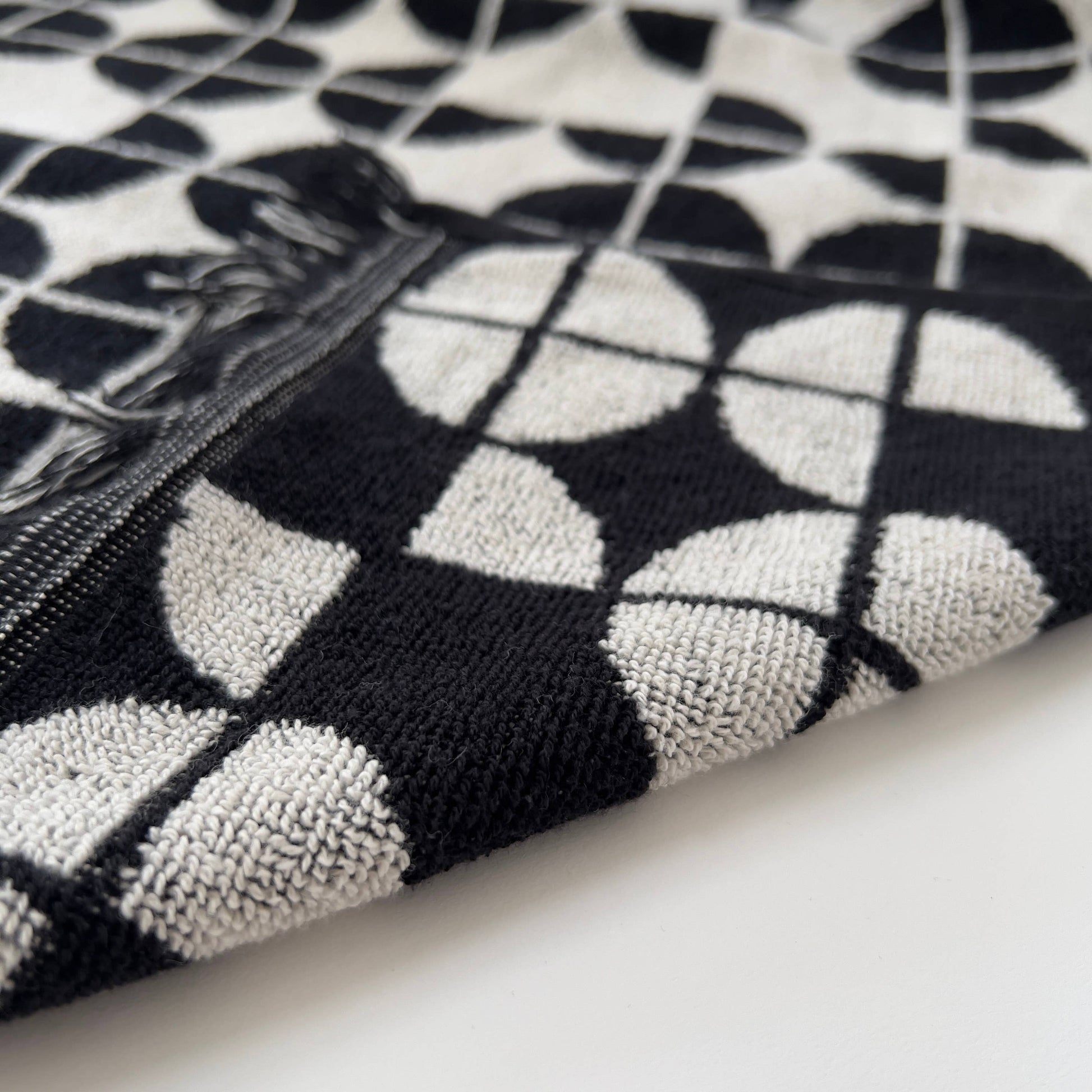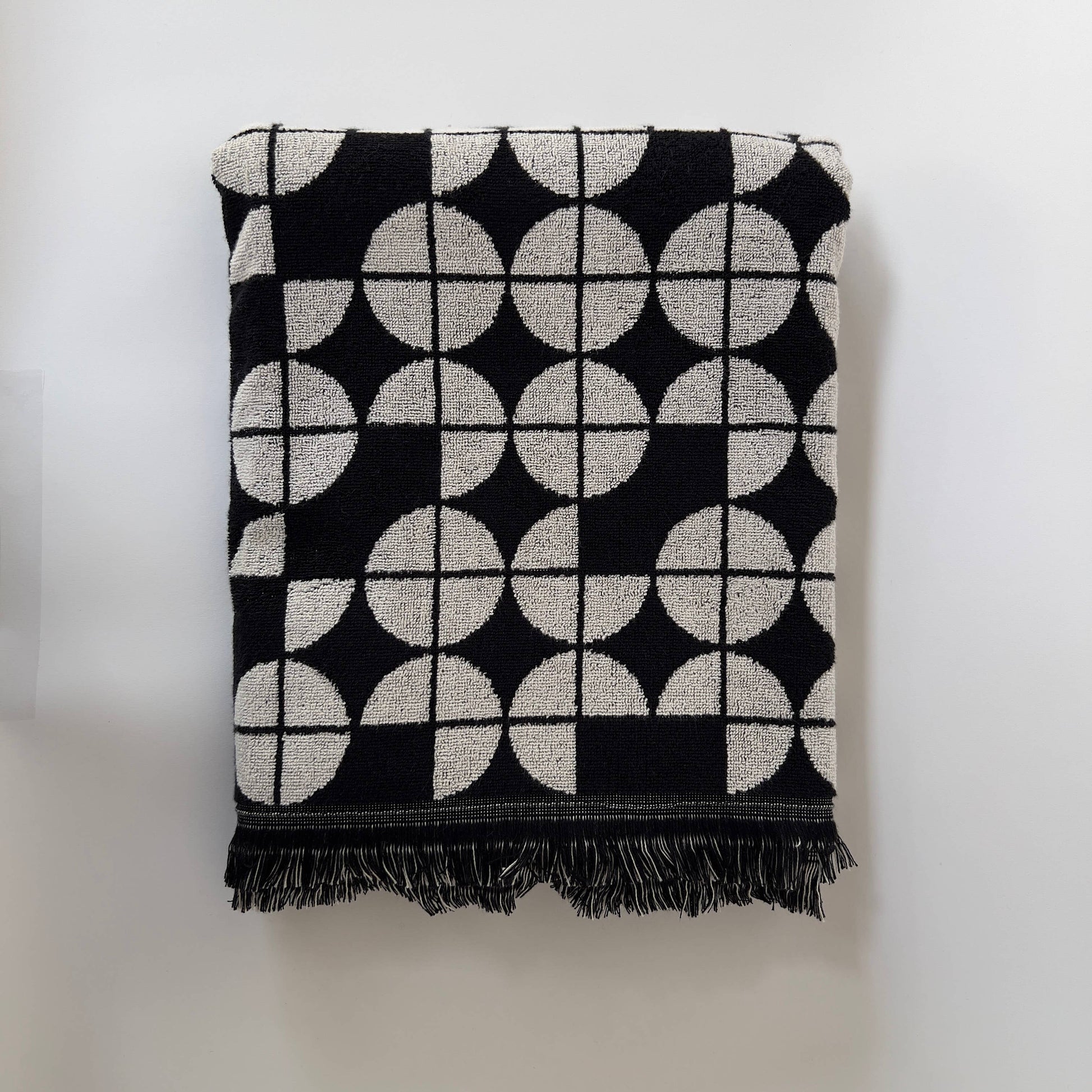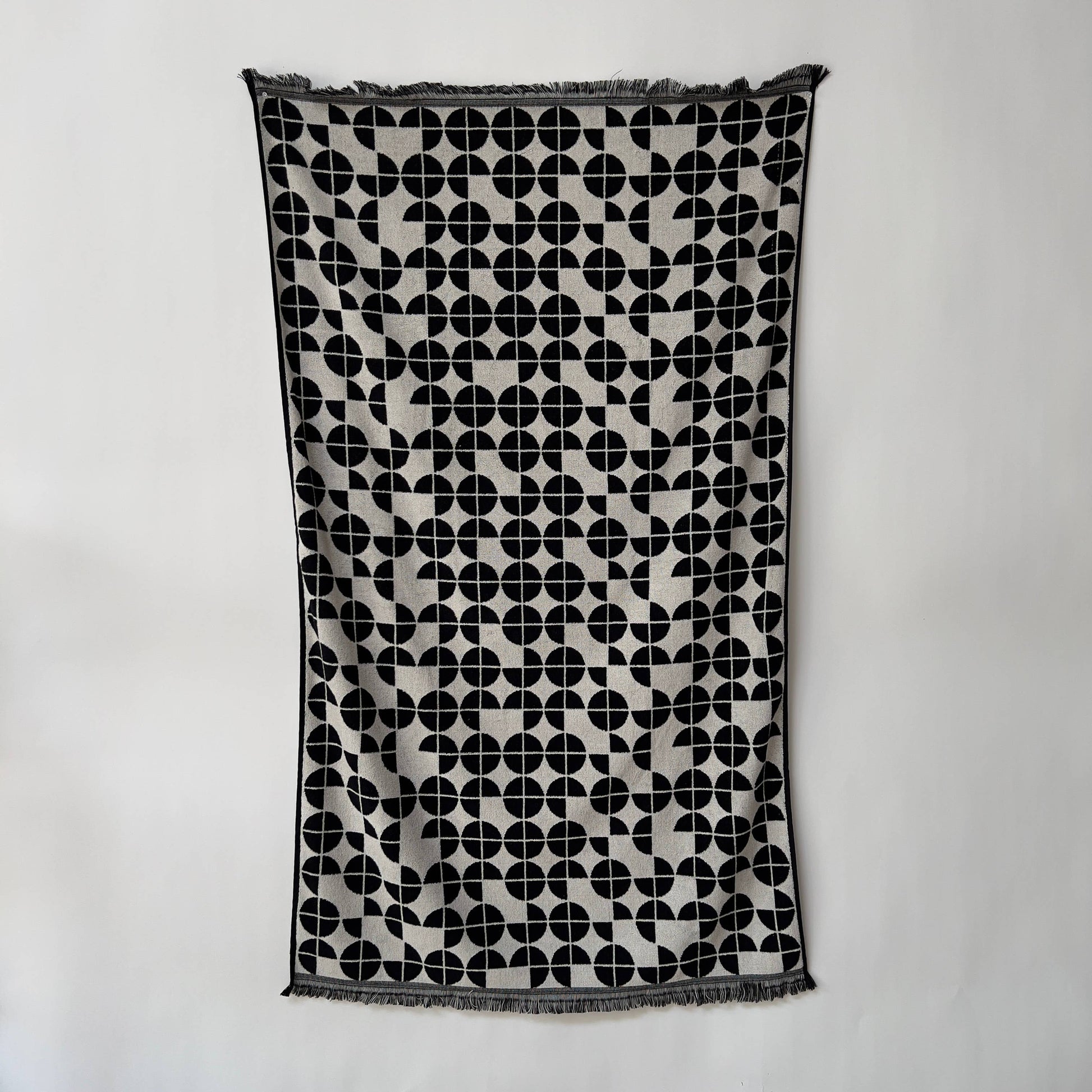 They are made in one-of-the-best producers in Turkey with the highest quality cotton. These towels feature a black-and-cream, modern geometric pattern. They have a reversible design, with the same circle design but opposite colors. Featured on top and bottom edges are salt-and-pepper eyelash tassels. These towels have a luxurious touch and a very dense, short pile. They are wonderful beach towels.