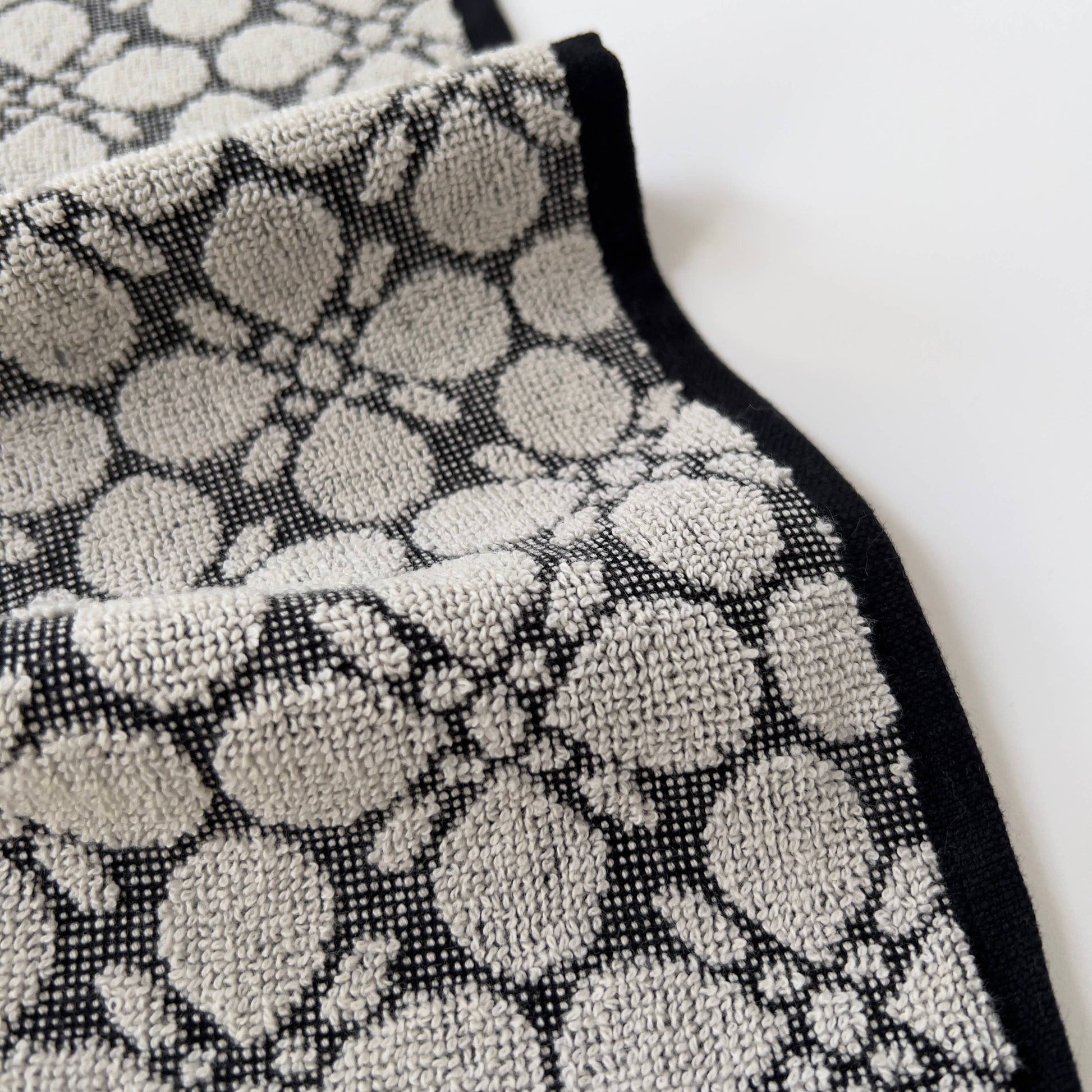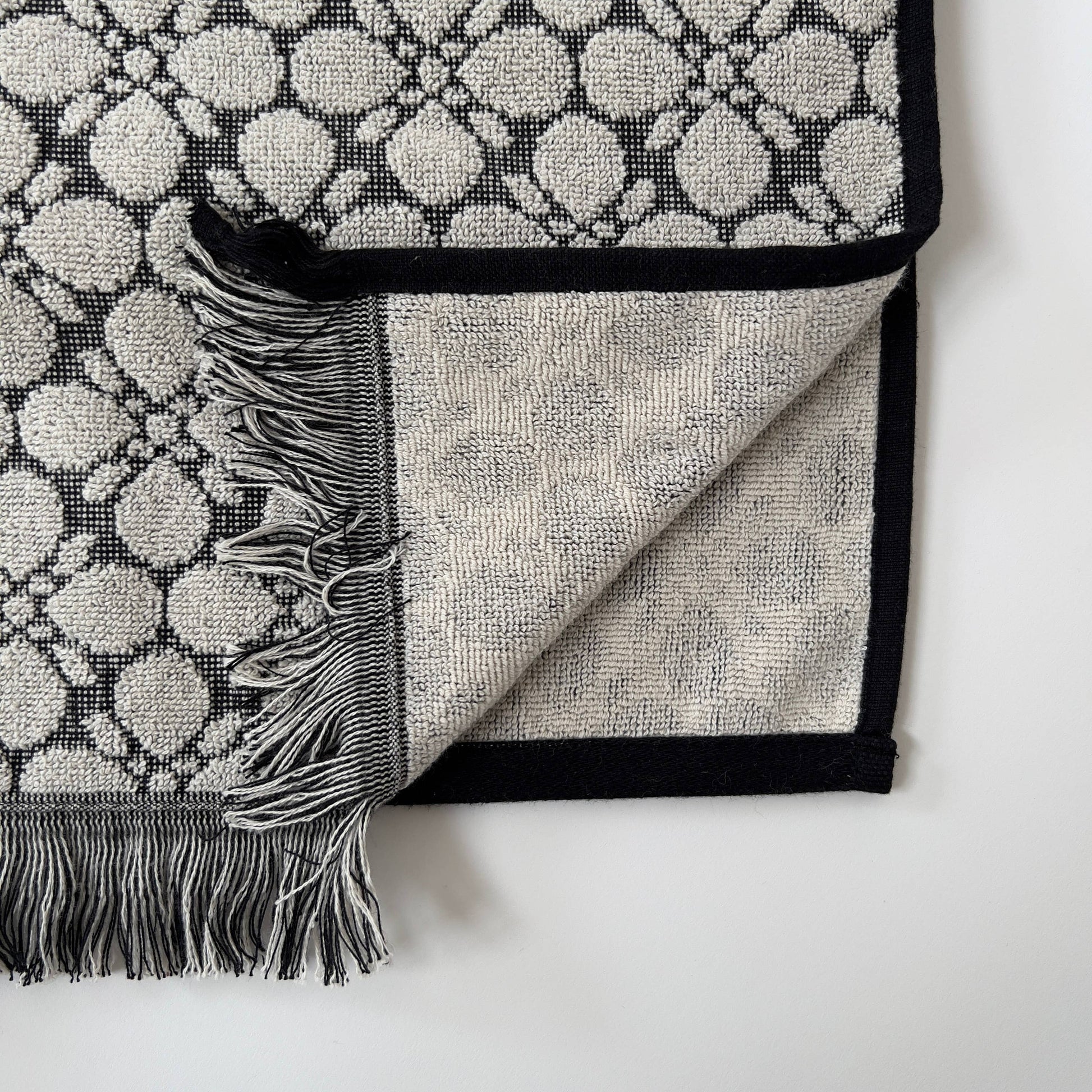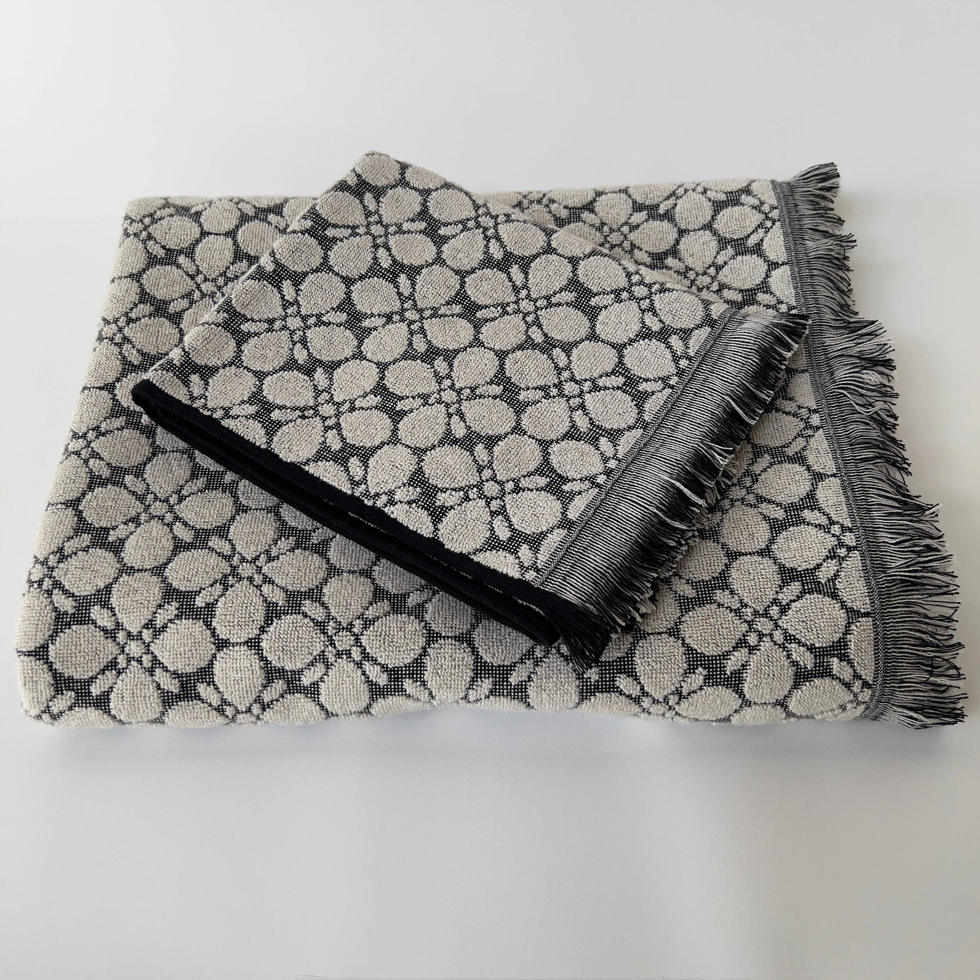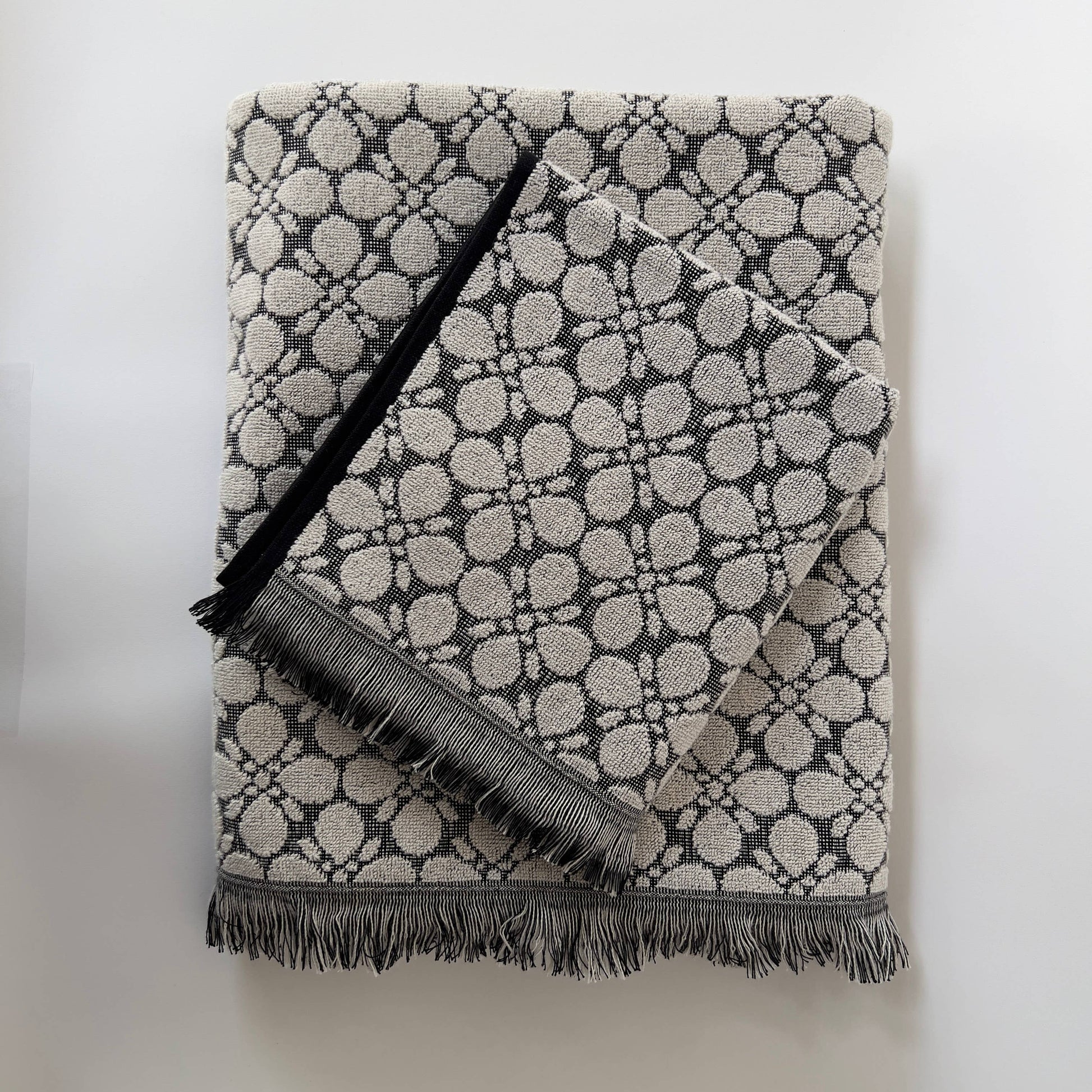 They are made in one-of-the-best producers in Turkey with the highest quality cotton. These towels feature a black-and-cream, modern geometric pattern. They have a reversible design, with the same circle design but opposite colors. Featured on top and bottom edges are salt-and-pepper eyelash tassels. These towels have a luxurious touch and a very dense, short pile. They are wonderful beach towels.